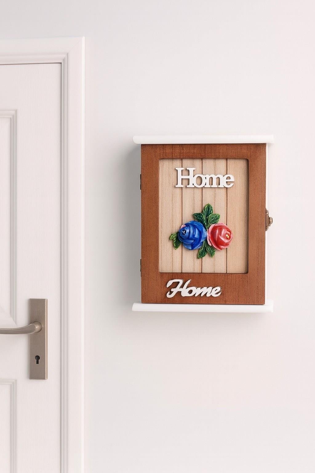 Anahtarlarınızı düzenli tutarken evinize zarif bir dokunuş katacak gül motifli ahşap anahtarlık kutusu, hem dekoratif hem de işlevsel tasarımıyla öne çıkıyor. Üzerindeki kabartmalı kırmızı ve mavi gül figürleri, “Home” yazısı ile birleşerek sıcak ve şık bir görünüm sunar.