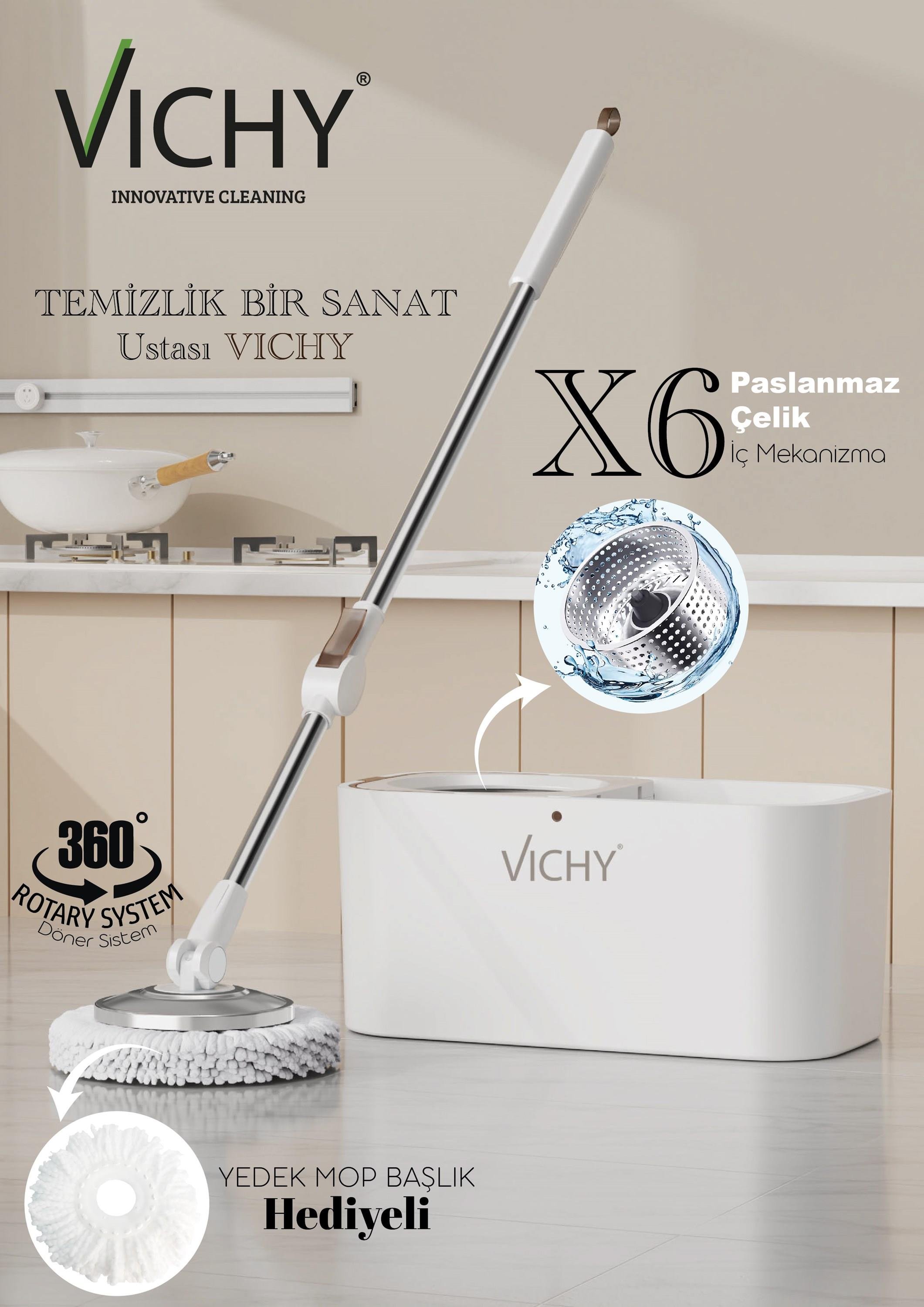 VICHY 360° Döner Mop Temizlik Seti Kolay Sıkma Kova, Mikrofiber Mop (Yedek Mop Hediyeli) VCH-6677 X6